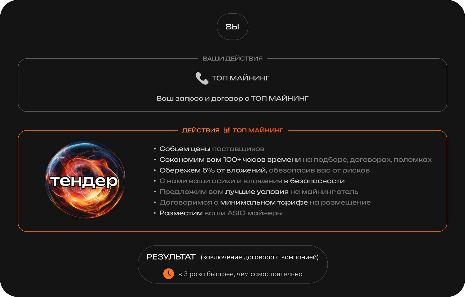 Рынок майнинга переживает очередной виток интереса. Но вместе с ростом спроса растут и риски: недобросовестные продавцы, завышенные цены, отсутствие гарантий. Команда ТОП МАЙНИНГ решила устранить эти проблемы, запустив уникальный сервис: тендерная система покупки майнеров. Это консалтинговая услуга, которая позволяет приобрести оборудование на 7-10% дешевле рынка, сэкономив до 100 часов личного времени и избежать юридических и финансовых рисков.